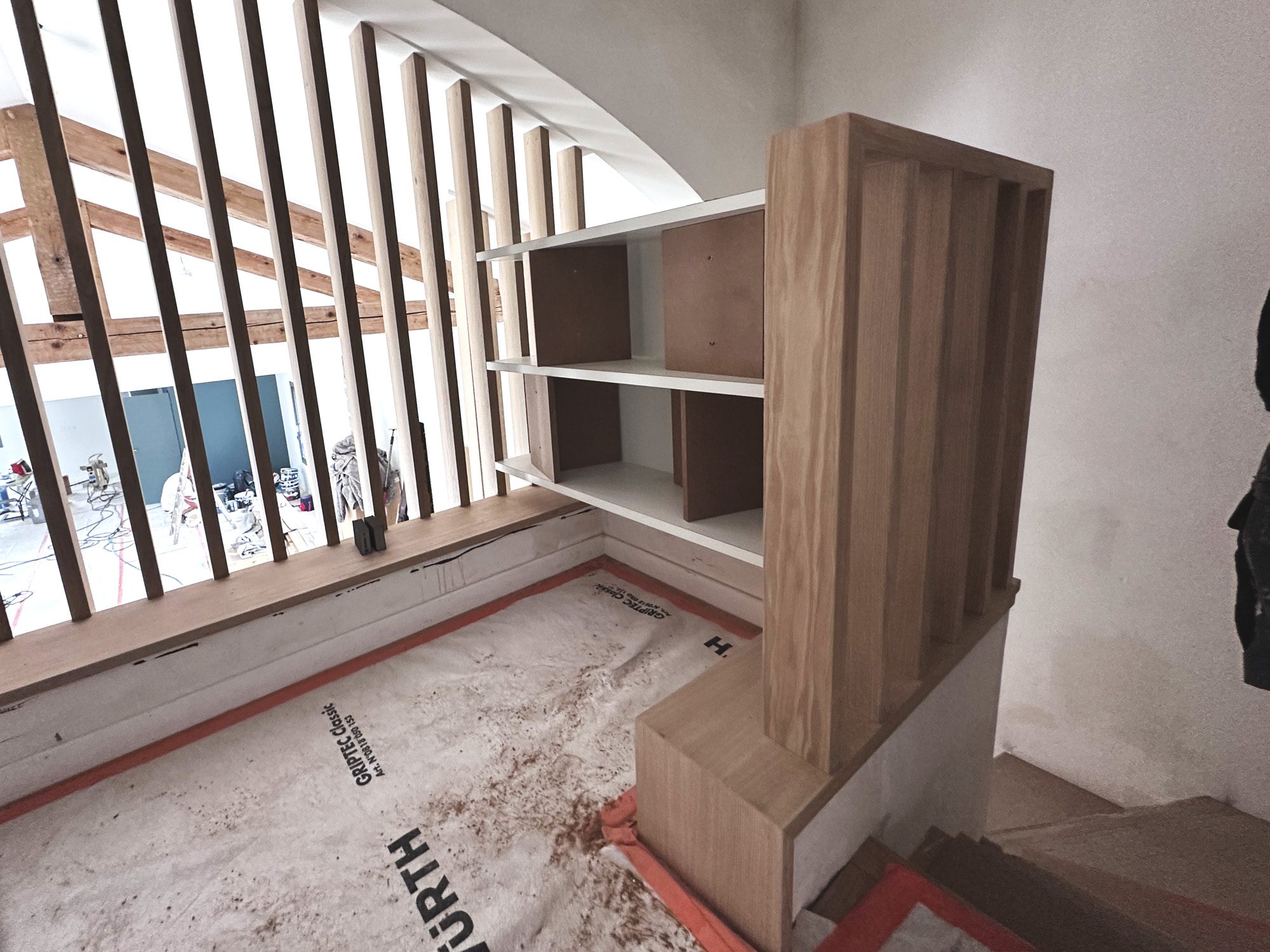 Nous avons pris le parti de traiter l’escalier comme un élément de décor principal de l’espace de vie. Des ventelles en chêne viennent dissimuler les éléments structurels courbes que les propriétaires souhaitaient voir disparaitre, et faire également office de garde-corps. Sur le palier, un petit bureau suspendu offre une niche côté escalier et vient donner une fonction au palier, tout en le sécurisant.