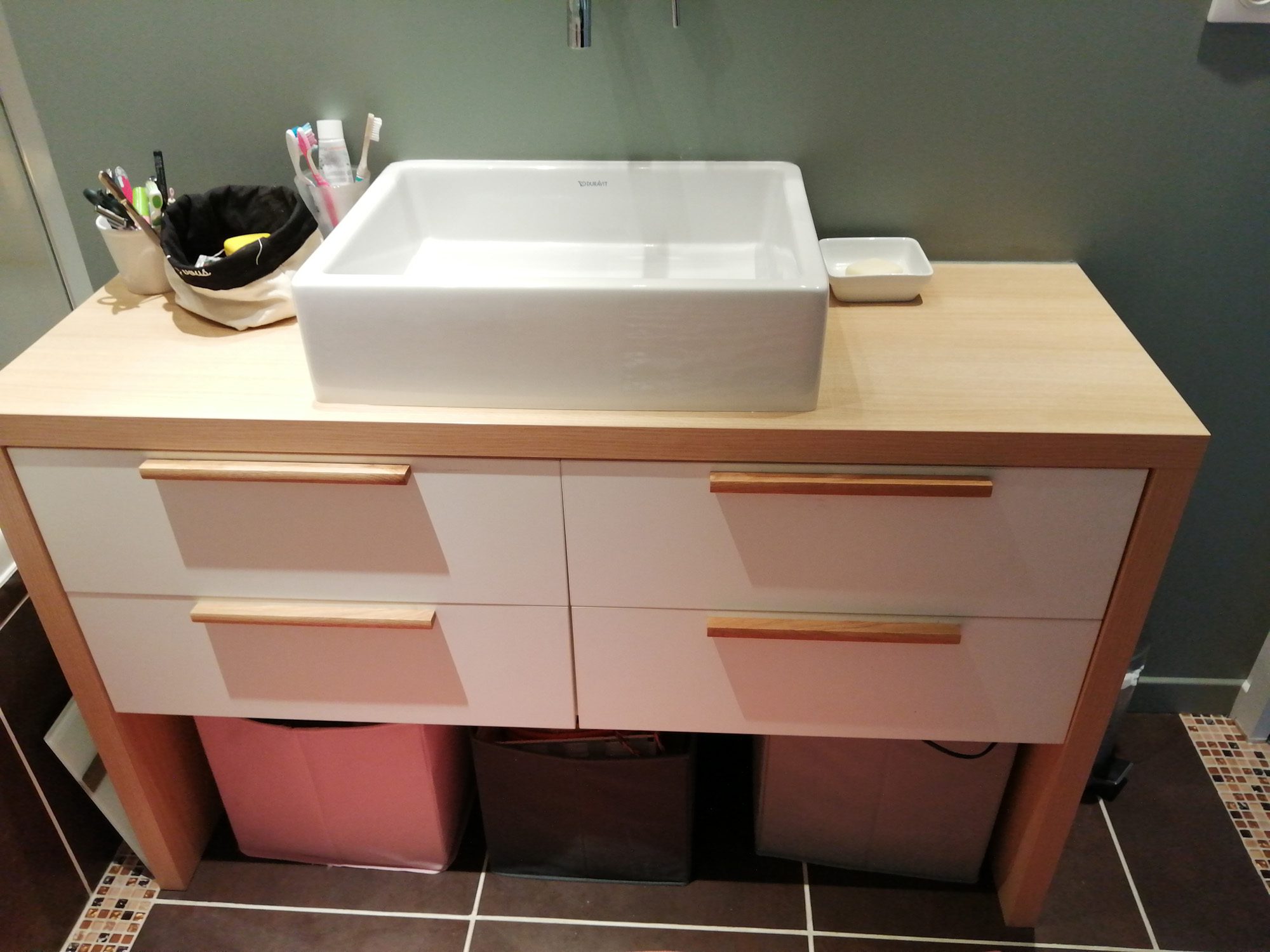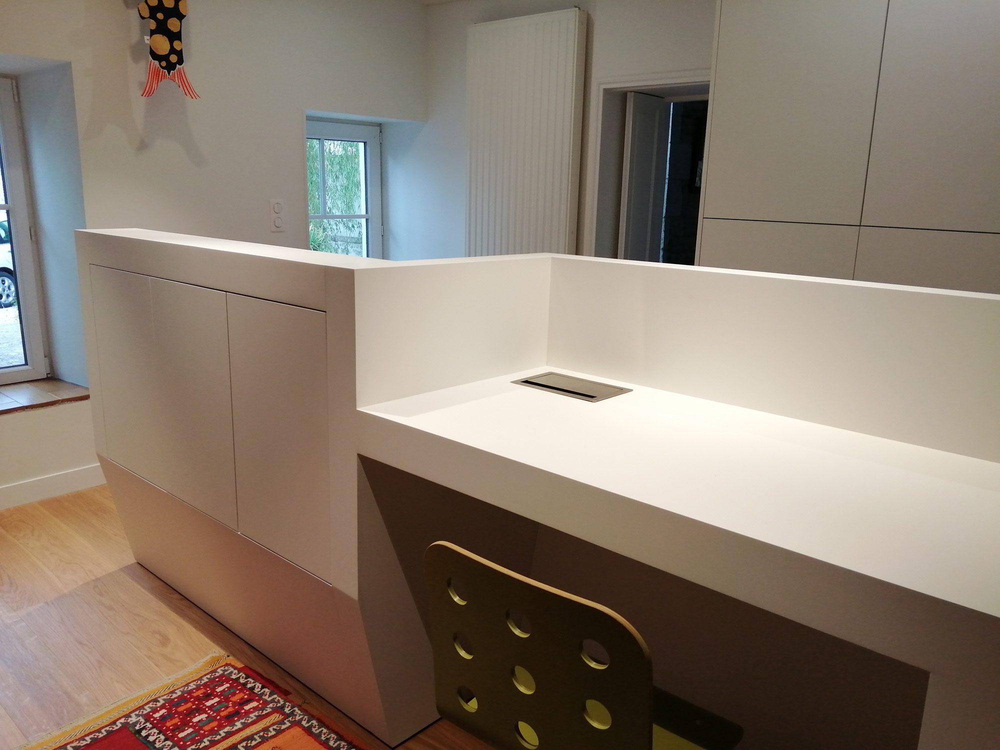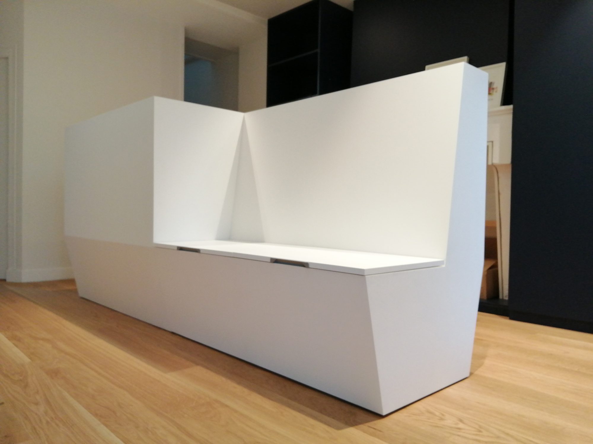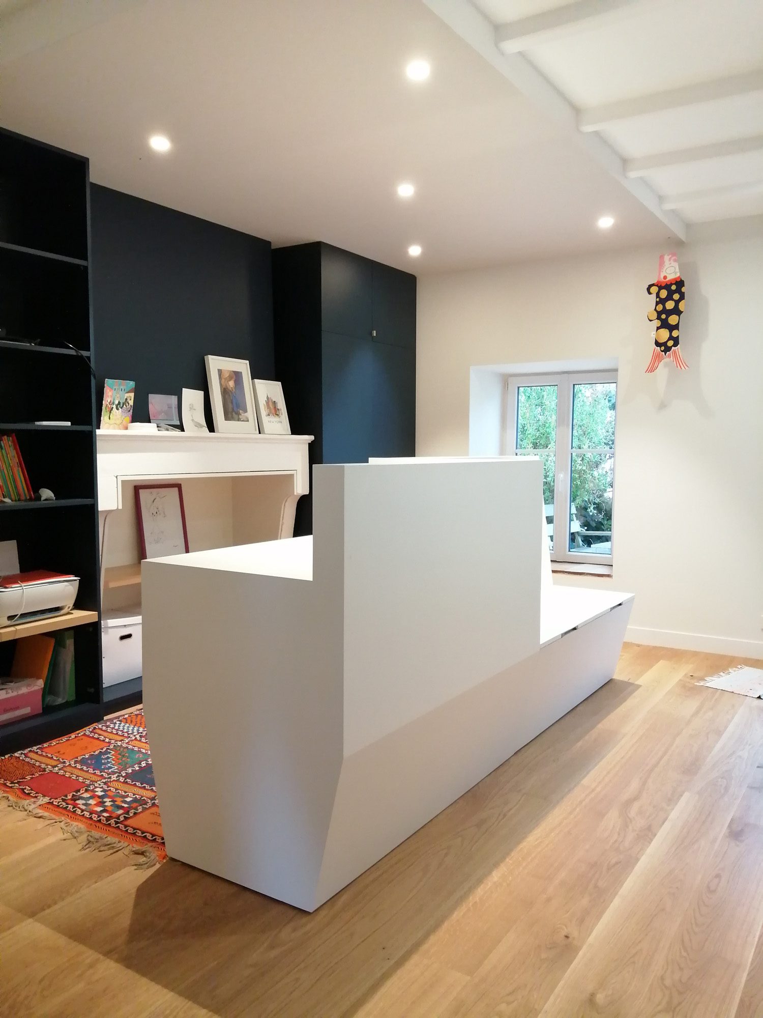 Dans l’entrée, un volume sculptural vient trouver place au milieu de la pièce, apportant à la fois la fonction de banc et coffre pour le déchaussage des enfants, et de bureau pour le télétravail des parents. En arrière, des rangements sont discrètement placés autour de la cheminée existante, et peints d’un bleu nuit pour faire ressortir le volume central.