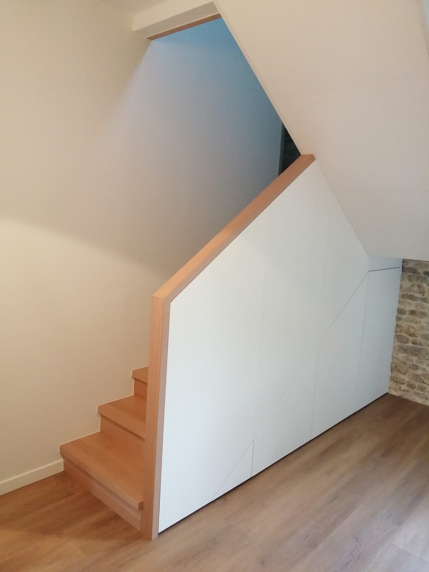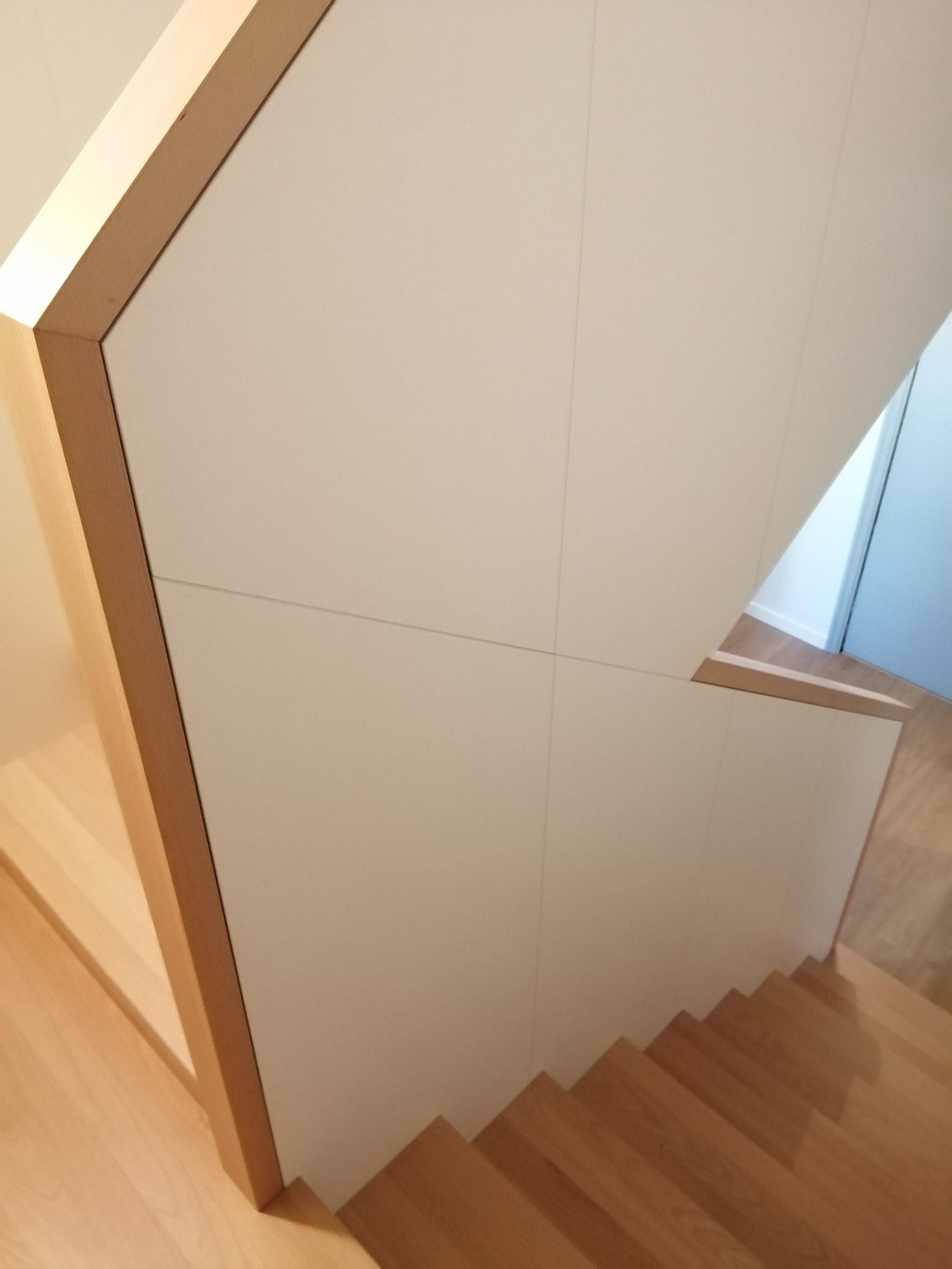 Les escaliers existants dans le séjour et dans les étages ont été déposés, et un nouvel escalier se séparant en deux volées symétriques a été réalisé au milieu de la maison comme un monolithe formé de panneaux blancs calepinés en respectant des acostages précis. Les marches et mains-courantes sont elles réalisées en bois massif.